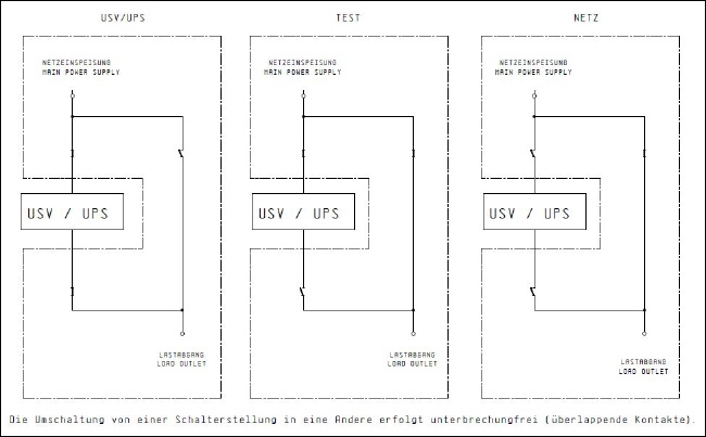 Wann eine externe Handumgehung mit Kippschaltern einsetzen? Eine externe Handumgehung mit Kippschaltern ist eine von der USV-Anlage unabhängige Bypass-Schaltung und verbindet die Netzspannung über eine Lastschalteran-ordnung direkt mit der USV-Verteilung/Last. Mit dieser Schaltung kann die USV-Anlage sowohl eingangs- als auch ausgangsseitig spannungsfrei geschaltet werden. Es können auch mehrere USV-Anlagen, egal ob leistungs-parallel oder redundant, jeweils einzeln oder gemeinsam freigeschaltet werden. Die Schaltlogik ist hierbei unbedingt zu beachten, daher sollen diese Anlagen nur von elektrotechnischen Fachkräften, die Anlagenkenntnis besitzen geschaltet werden. Der Einsatzbereich bei Handumgehungen mit Kippschaltern oder Lasttrennern beginnt bei 63A, 1- oder 3-phasig und reicht bis 1.250A, 3-phasig, in projektierten Anlagen auch noch größer.