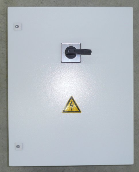 Externe Handumgehung im Stahlblech-Wandgehäuse b: 400, h: 500, t: 250 Schutzart IP54, Farbe: RAL 7035 bis 40kVA, 3-phasig. Handbypass mit Drehschalter 63A, 4-pol. mit 3 Schaltstellungen: USV - Test - Bypass. Mit Klemmanschlüssen bis 35mm2; zur einfachen Montage.